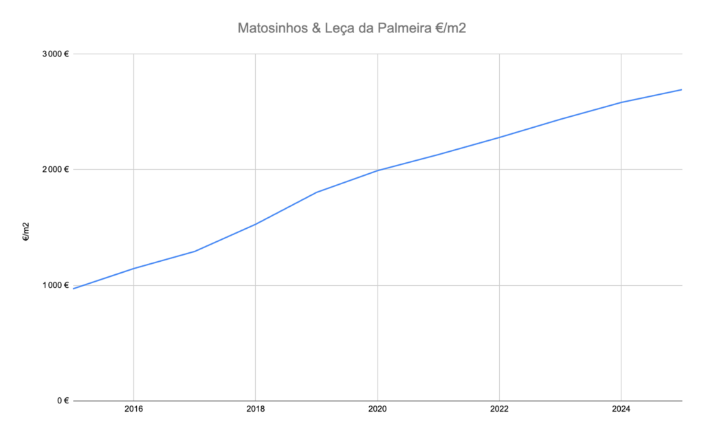Prix plus élevés en première ligne de mer ou dans les zones les plus recherchées (Matosinhos Sul, Leça da Palmeira)