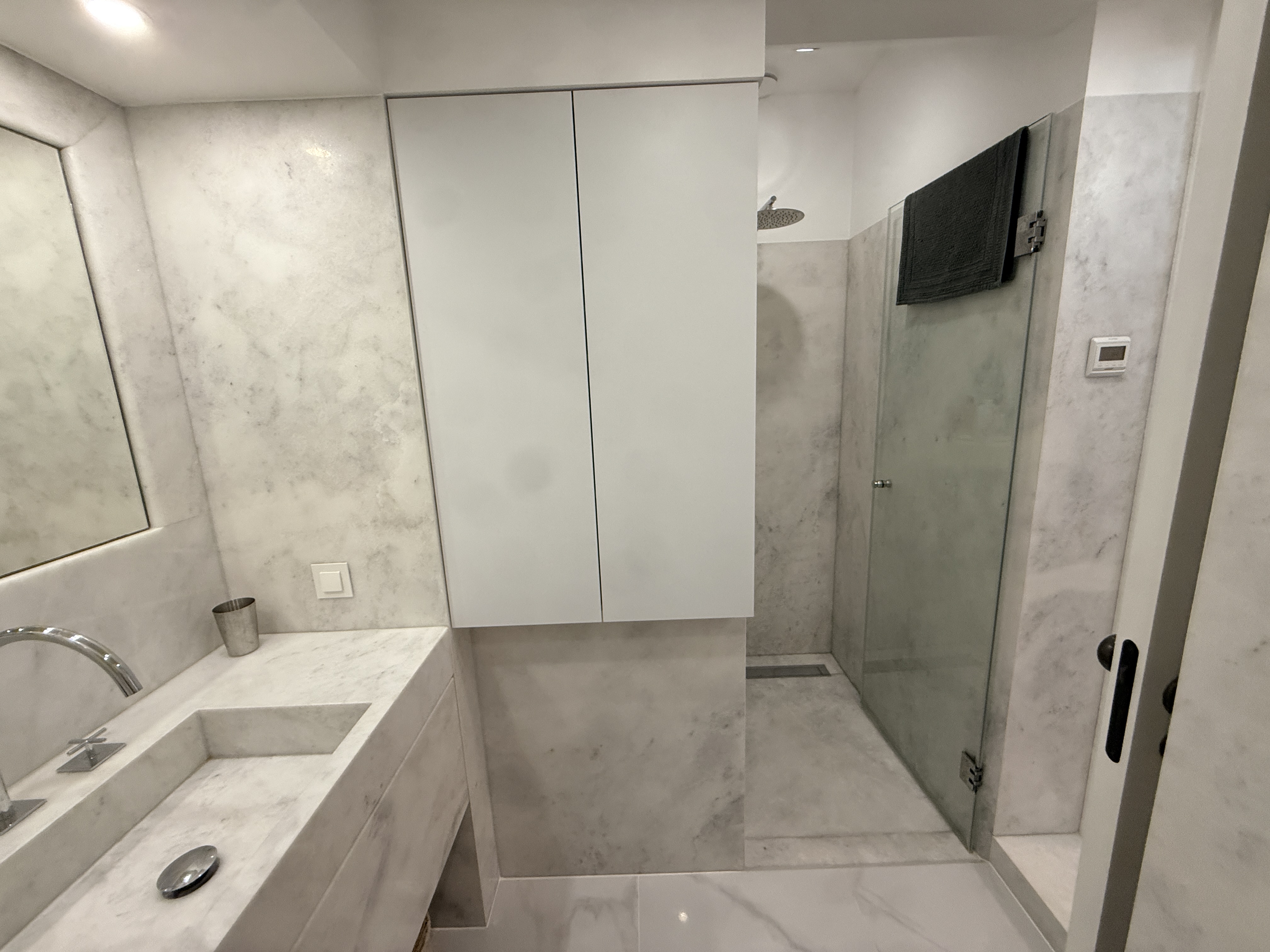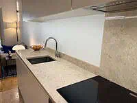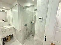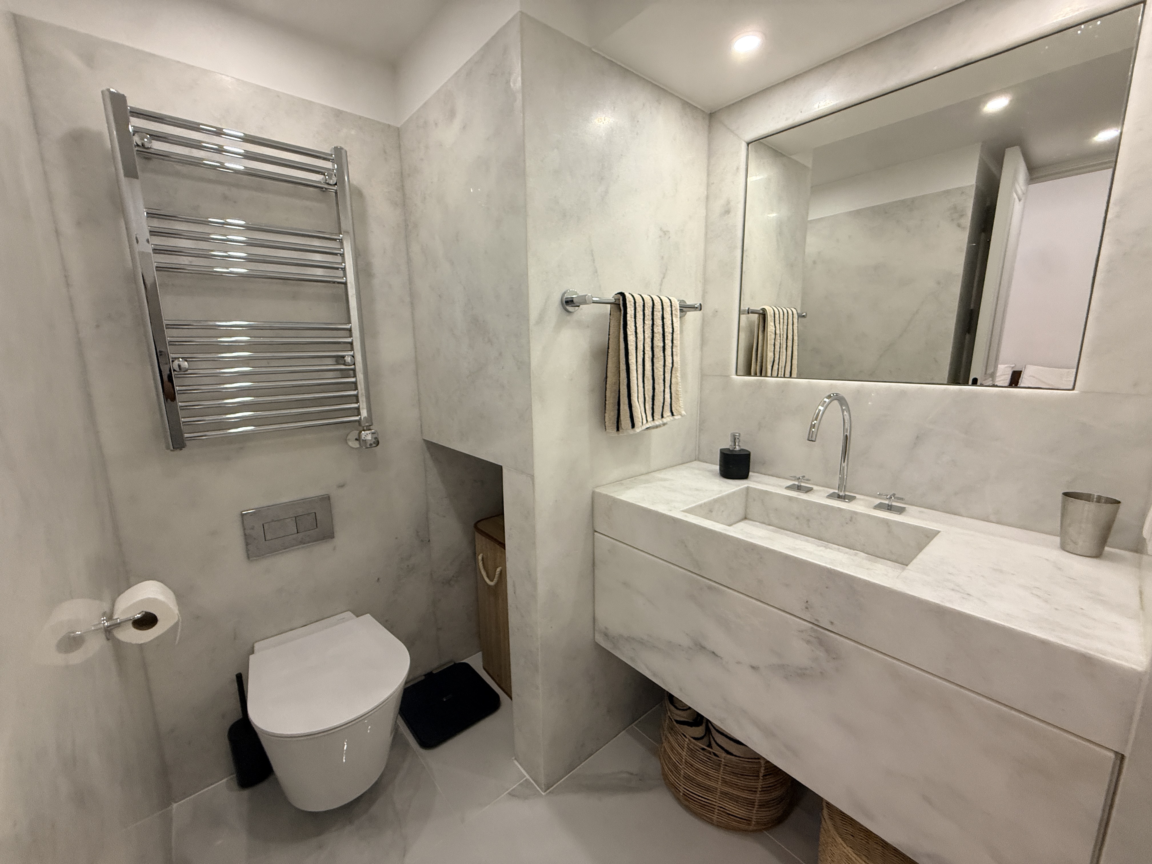 * Pedra natural (mármore e lioz), que acrescenta textura e nobreza aos espaços