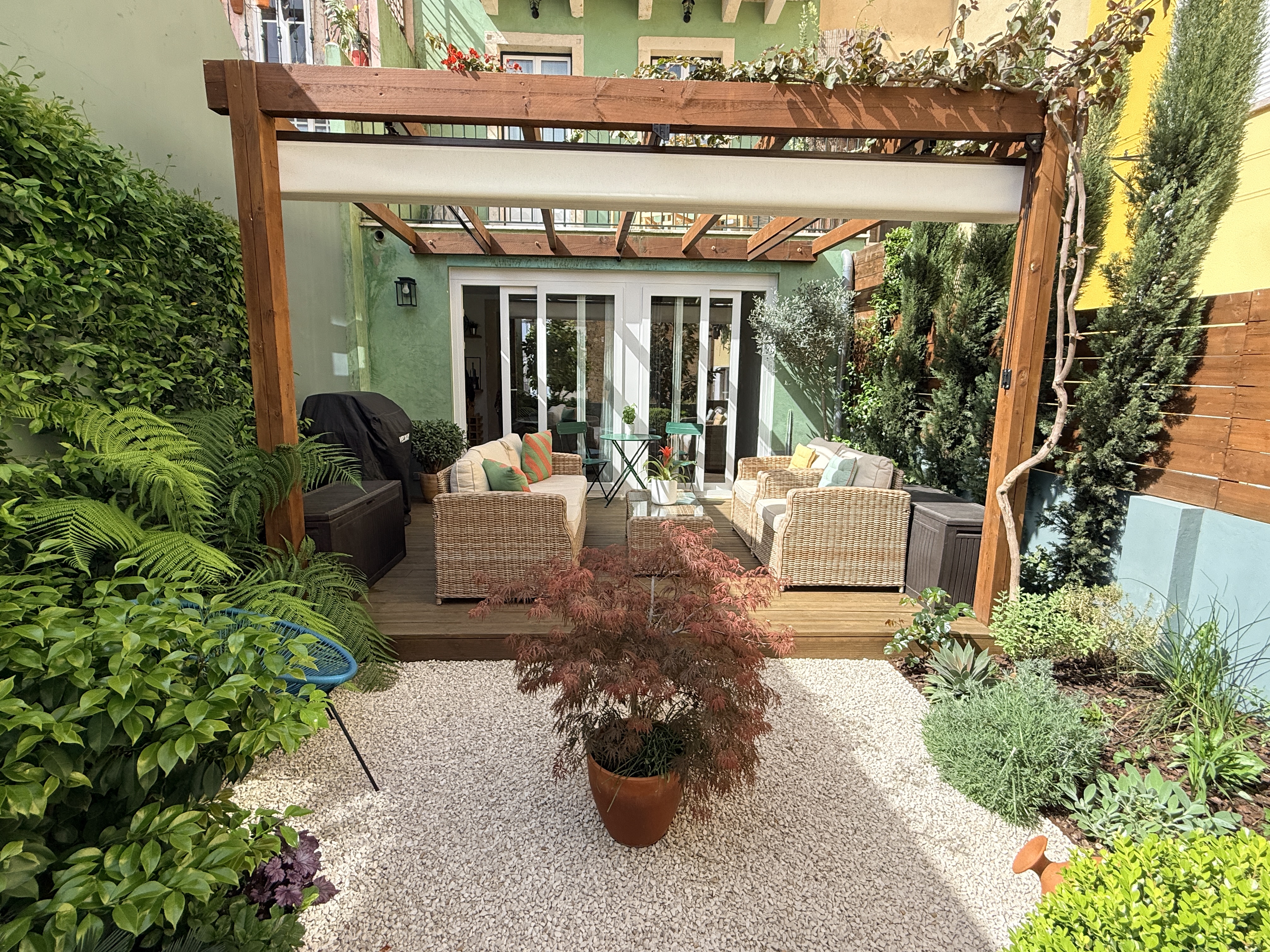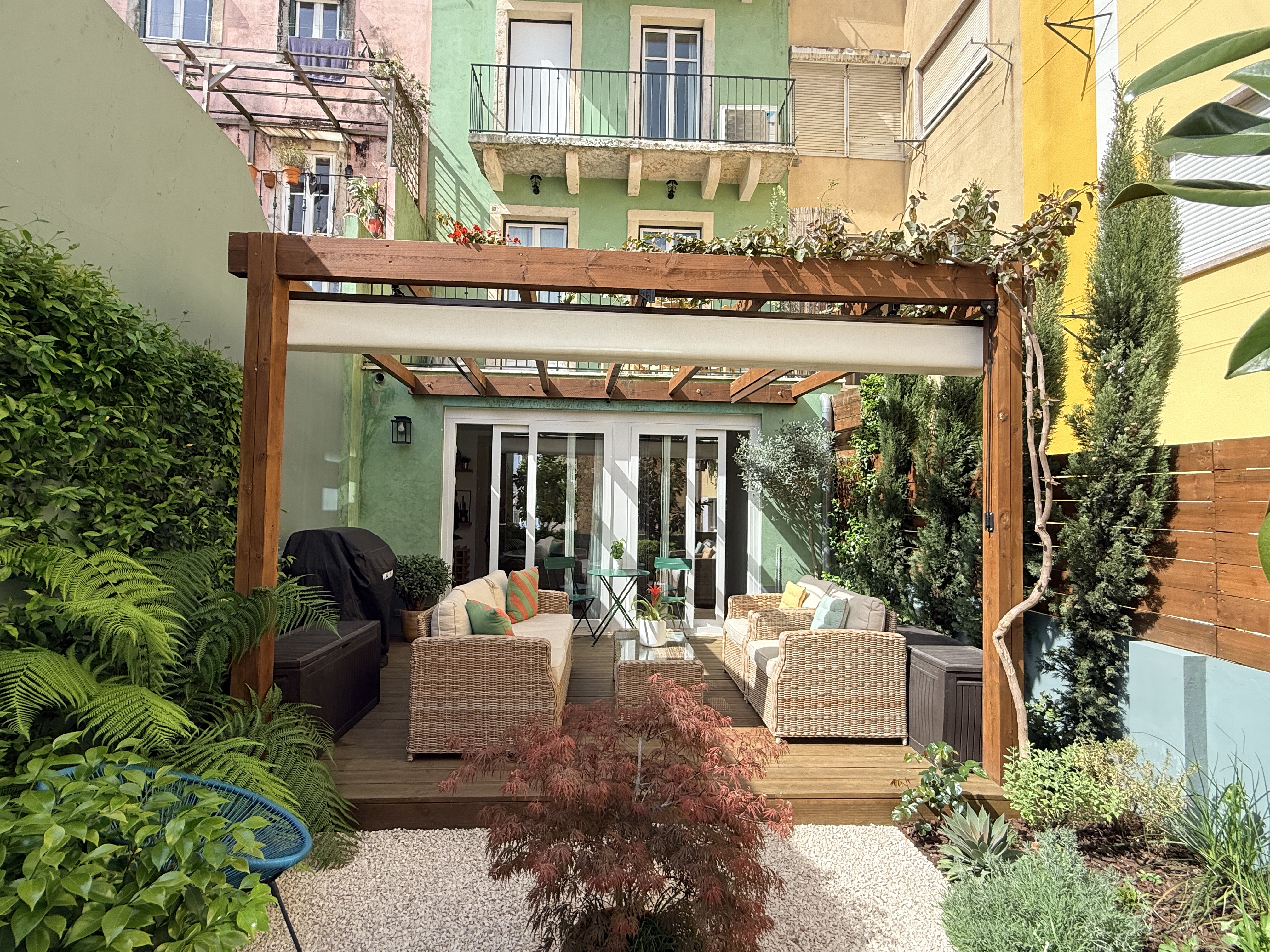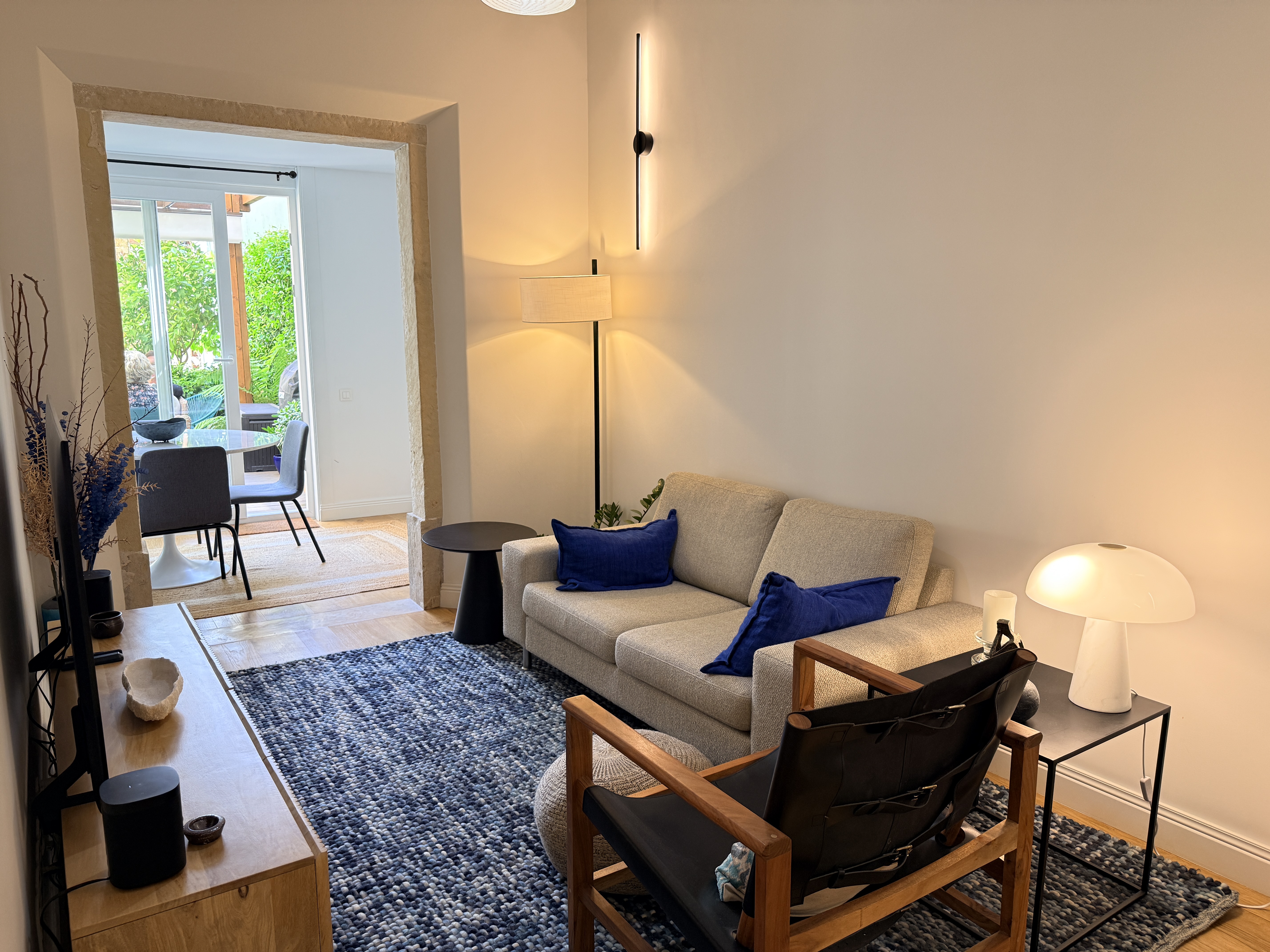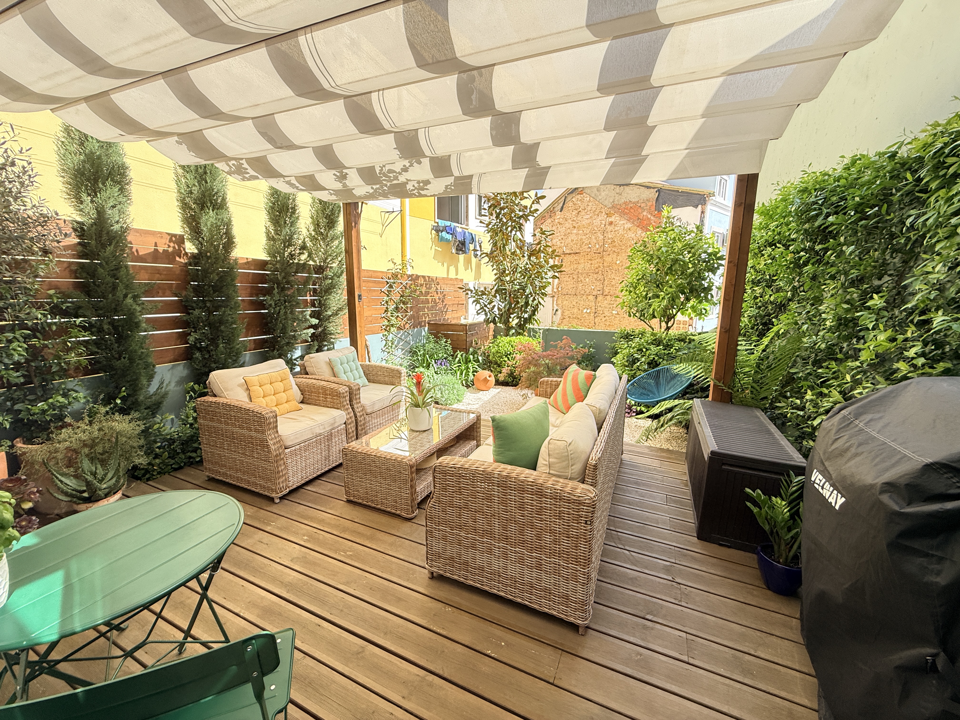 O grande protagonista é o jardim privativo desenhado por paisagista — um espaço intimista e envolvente, perfeito para pequenos-almoços ao sol, jantares ao final do dia ou simplesmente para desacelerar em pleno centro urbano. Um verdadeiro prolongamento da sala, onde a vida acontece ao ar livre.